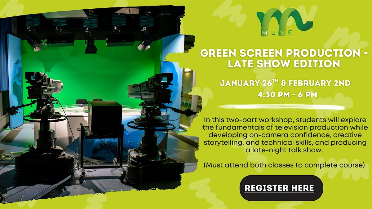 This workshop will introduce students to the basic use and role of green screen chromakey technology and how it is used to create a professional late-night TV talk show.
