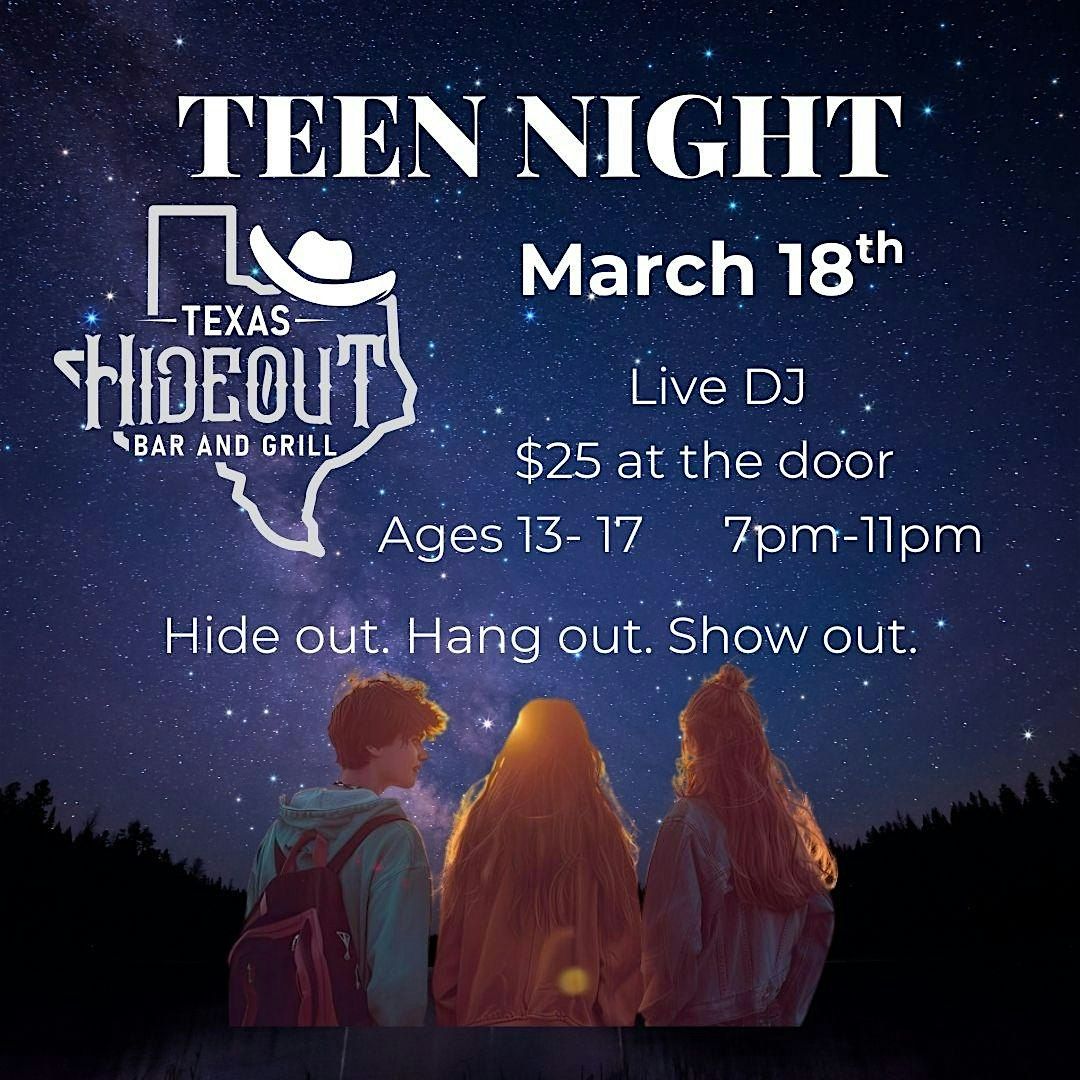 Get ready for an epic in-person night packed with fun just for teens! Join us at Texas Hideout for games, music, and tons of cool hangout moments. It's the perfect chance to kick back, make new friends, and enjoy a night tailored to you. Don’t miss out on the best teen night around – see you there!