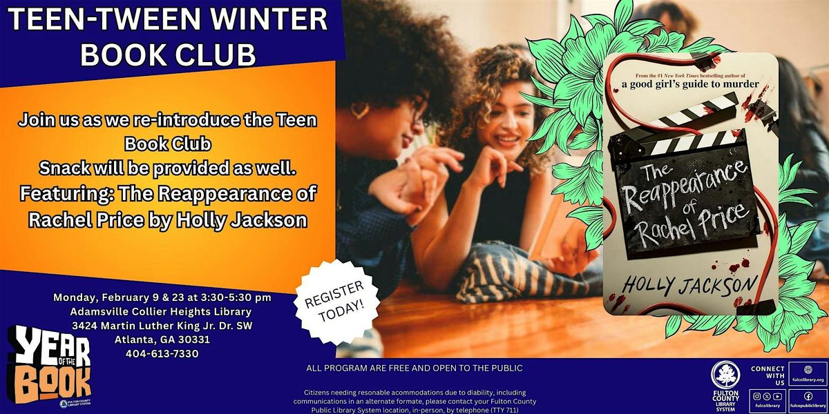 Welcome to the TEEN-TWEEN WINTER BOOK CLUB! Join us at the Adamsville-Collier Heights Library on Monday, February 9 & 23, at 3:30-5:30 PM for a fun and engaging book discussion. Choose from our selection to dive into exciting stories with fellow book lovers. Let's share our thoughts, favorite characters, and plot twists in a cozy and welcoming atmosphere. Don't miss out on this opportunity to connect with other readers and discover new literary adventures. See you there!