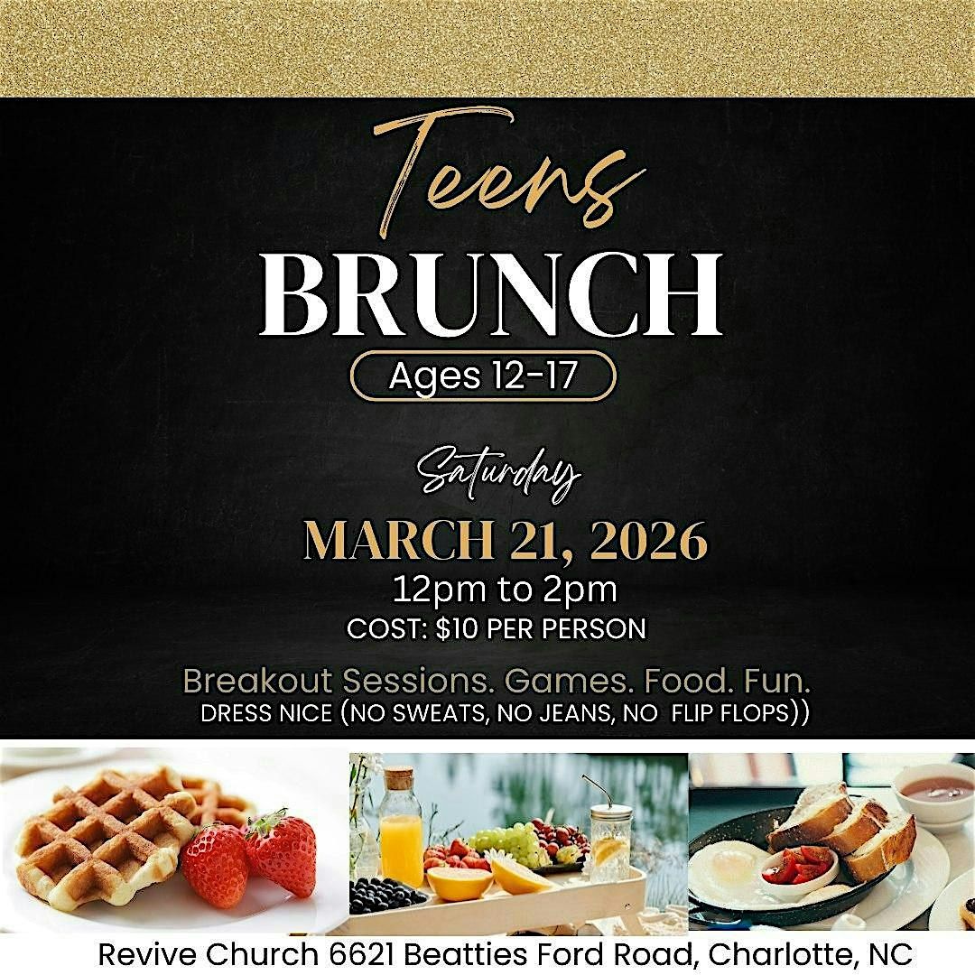 Hey there! Come hang out at Revive Church Charlotte on March 21, 2026 at 12:00 PM (Eastern Time) for a fun and relaxed brunch just for teens. It's a great chance to meet new friends, enjoy some tasty food, and kick back in a welcoming space. Don’t miss out on fun, fellowship, games, breakout sessions and biblical teaching. It's going to be an amazing time. See you there!