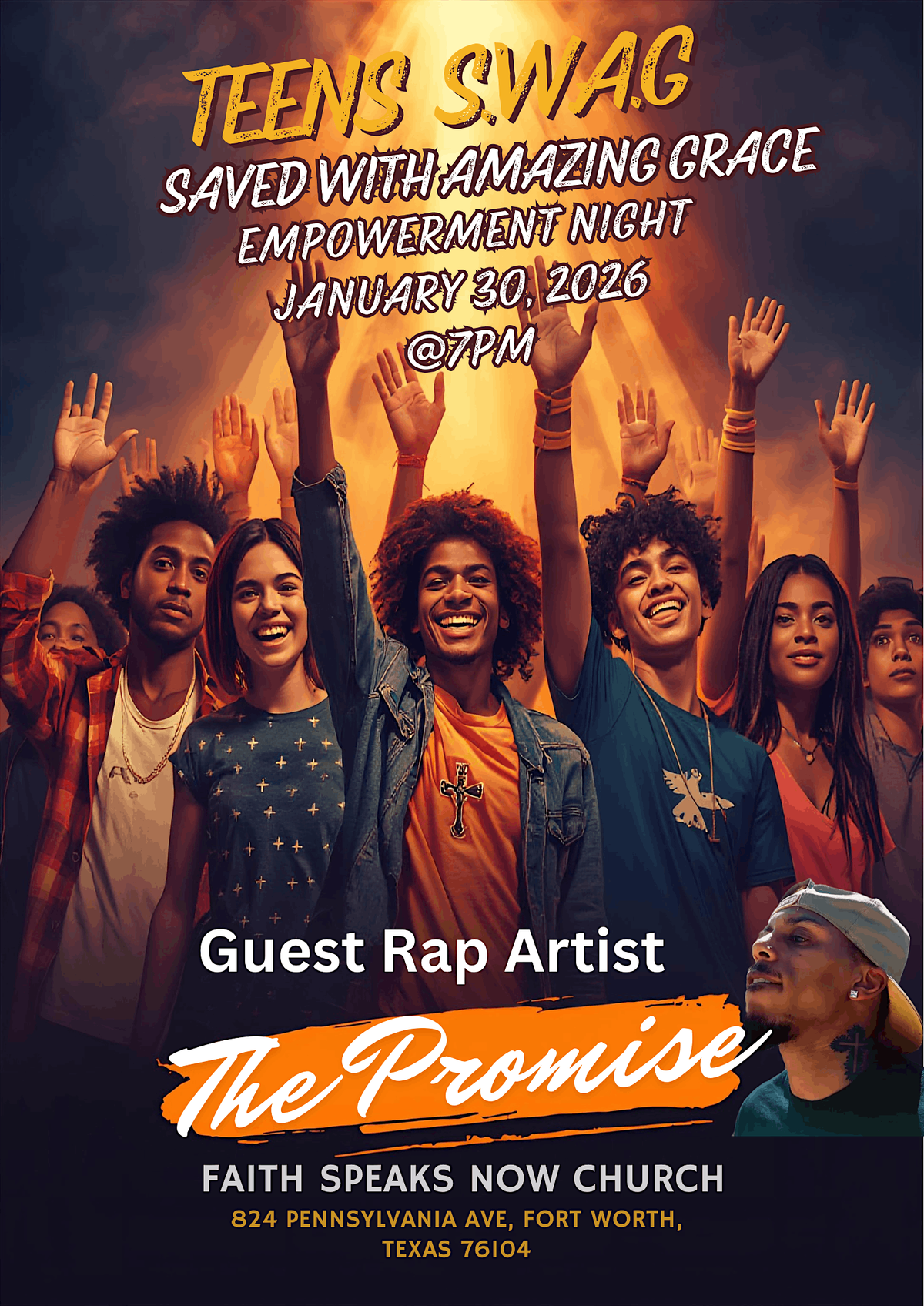 A free Christian Rap Concert with Guest Artist "The Promise" for Teens, come ready to be inspired, uplifted, and be reminded that you are Saved With Amazing Grace( S.W.A.G)