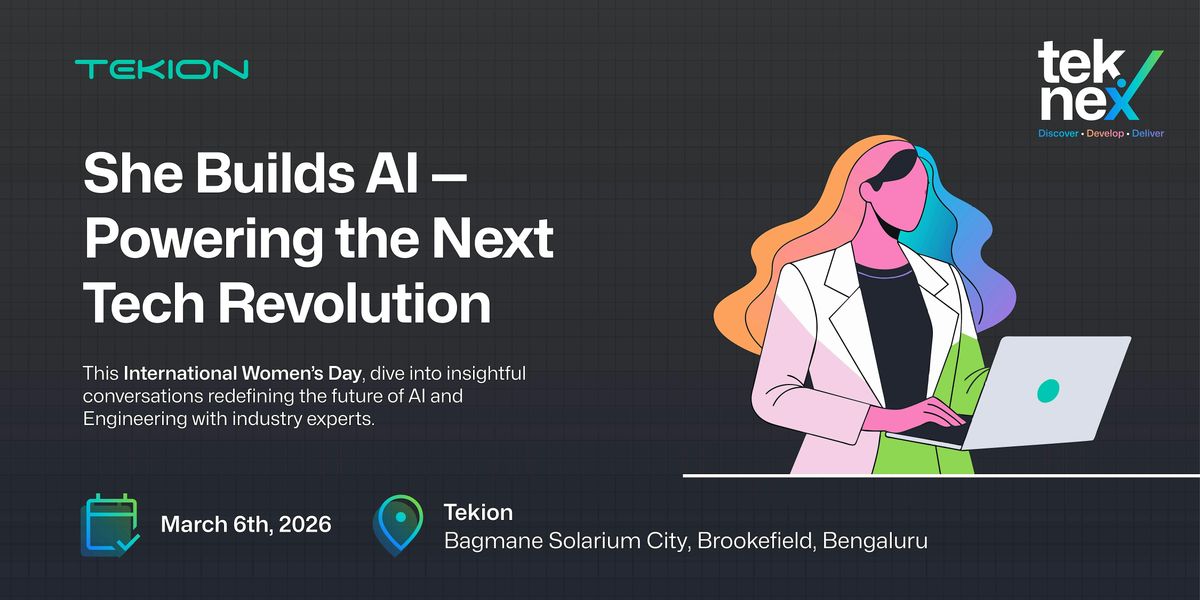 She Builds AI – Powering the Next Tech Revolution is a panel discussion hosted by Tekion, focused on innovators building and scaling AI-driven technologies. This session is exclusively for women students across all campuses and offers insights into real-world applications of AI and emerging technology trends through discussions with industry leaders. Women students in and around Bangalore are encouraged to attend the event in person at our Bangalore office.