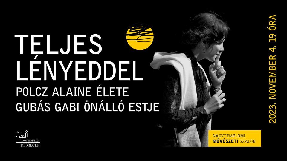 A Teljes lényeddel című színházi est, a Nagytemplomi Művészeti Szalonban a Polcz Alaine életén kísérli meg a hallgatóságot végigvezetni – egészen fiatal korától az utolsó napokig. ?? Polcz Alaine (pszichológus, tanatológus, a Hospice Alapítvány alapítója) a legnagyobb hatású alkotó asszonyok közé tartozik. Írásaival tudatosan dolgozta fel újra és újra a vele történteket, s tette ezt úgy, hogy finoman kézen fogva tanítja meg olvasóját élni, túlélni s meghalni. A színházi est pont erre az attitűdre koncentrál, s lépésről lépésre vezeti a nézőt azon az úton, melynek a végén mindannyian elsajátíthatjuk azt a különleges valamit – nevezzük „élettechnikának” –, amit Polcz Alaine ad nekünk. Kikezdhetetlen őszinteséggel tárja fel saját életének minden fájdalmas epizódját úgy, ahogy az ember csak a legjobb barátaival beszél.