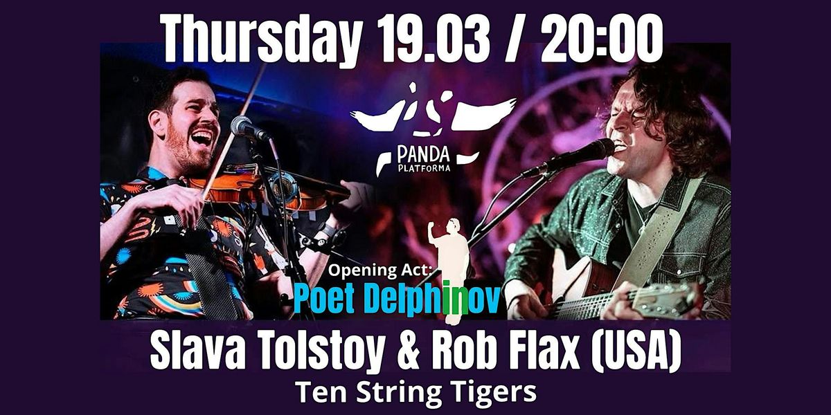 Впервые на сцене Панда-платформы выступит американский дуэт Ten String Tigers - это Слава Толстой (гитара, вокал) и Роб Флакс (скрипка, мандолина, вокал).