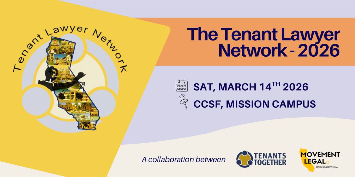 The Tenant Lawyer Network was created to support an ecosystem of attorneys that represent tenants. Now in its 14th year, with the support of Tenants Together and the California Center for Movement Legal Services, the conference returns in person. Join tenant attorneys from non-profits, government and the private sector on March 14th, 2026, and earn up to 6.5 MCLE credits.
