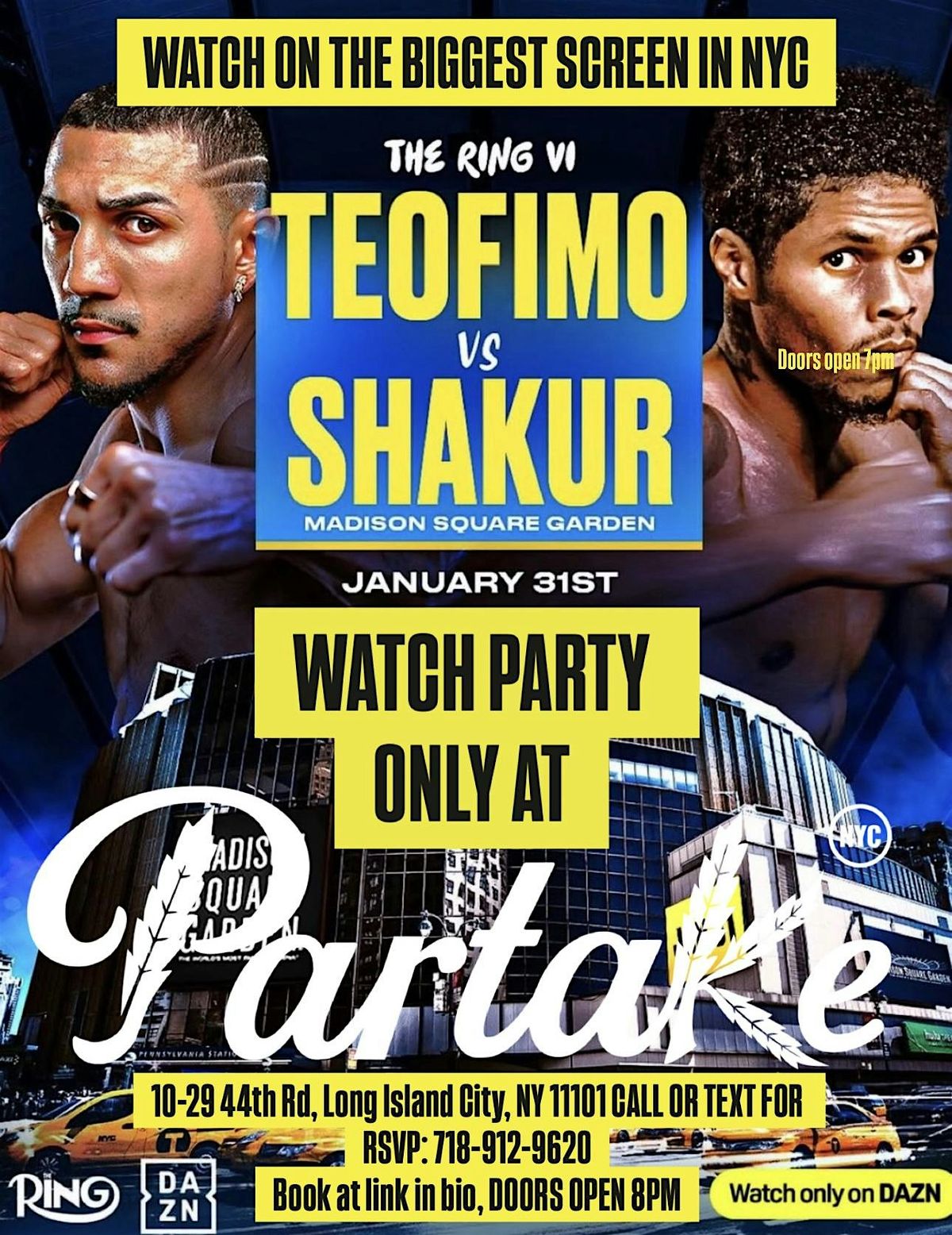 Experience The Ring like never before at Partake NYC, home to one of the biggest screens in New York City. Join us for an electrifying fight night watch party as Teofimo Lopez goes head-to-head with Shakur Stevenson at Madison Square Garden.