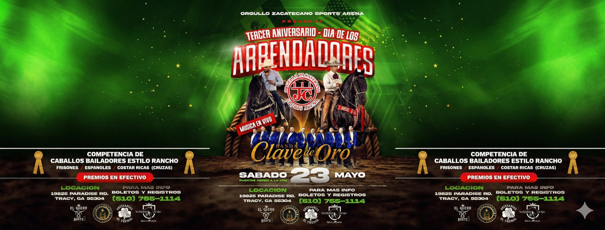 Experience the exciting event 'TERCER ANIVERSARIO - DIA DE LOS ARRENDADORES ' at Orgullo Zacatecano Sport Arena, Tracy, CA, United States. This must-attend gathering promises an unforgettable experience for all attendees. Join us for a day filled with innovation, networking, and inspiration. Book your attendance today and be part of something extraordinary. #TERCERANIVERSARIO-DIADELOSARRENDADORES #event #exciting #TracyEvents #CAEvents