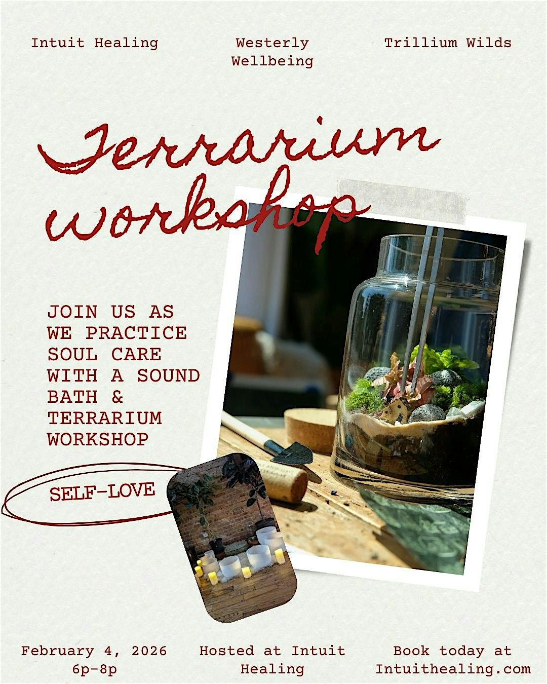 Join Intuit Healing Co., Westerly Wellbeing, and TrilliumWilds for a nourishing, two-hour evening that blends meditation, creativity, and connection to nature. We will begin with a 60-minute heart-centered sound bath led by Nicole Chandler Eng of Westerly Wellbeing. This guided meditation will focus on self-love, reflection, and intention-setting, inviting you to explore what it means to give a little more care and compassion to yourself so your life can grow in the direction you’re ready to cultivate. After the sound bath, guests will enjoy a brief refreshment break, allowing time to transition and integrate before moving into the creative portion of the evening. You’ll then return for a hands-on terrarium-making workshop led by TrilliumWilds. All plants and materials are provided. You’ll learn about soil, plant selection, and care while creating a personalized terrarium to take home. Your finished terrarium will serve as a living totem—a visual reminder of what you are nurturing within yourself and continuing to grow long after the evening ends. You’ll leave feeling: Deeply relaxed and grounded Educated about plants and terrarium care Connected to a new community Supported in your intentions through a tangible, living creation No prior experience is needed—just curiosity and a willingness to slow down. Date: Wednesday, February 4, 2026 Time: 6:00–8:00 PM Location: Intuit Healing Co. Investment: $75 per ticket