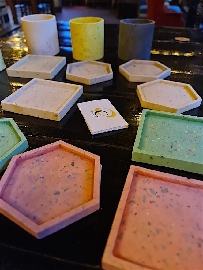 Learn how to mix your resin, add terrazzo chips and finish off your designs. You will have time to order some food/drink while your moulds are drying. Choose to create a plant pot or 2 coasters/trinket trays in a hexagonal or square shape.