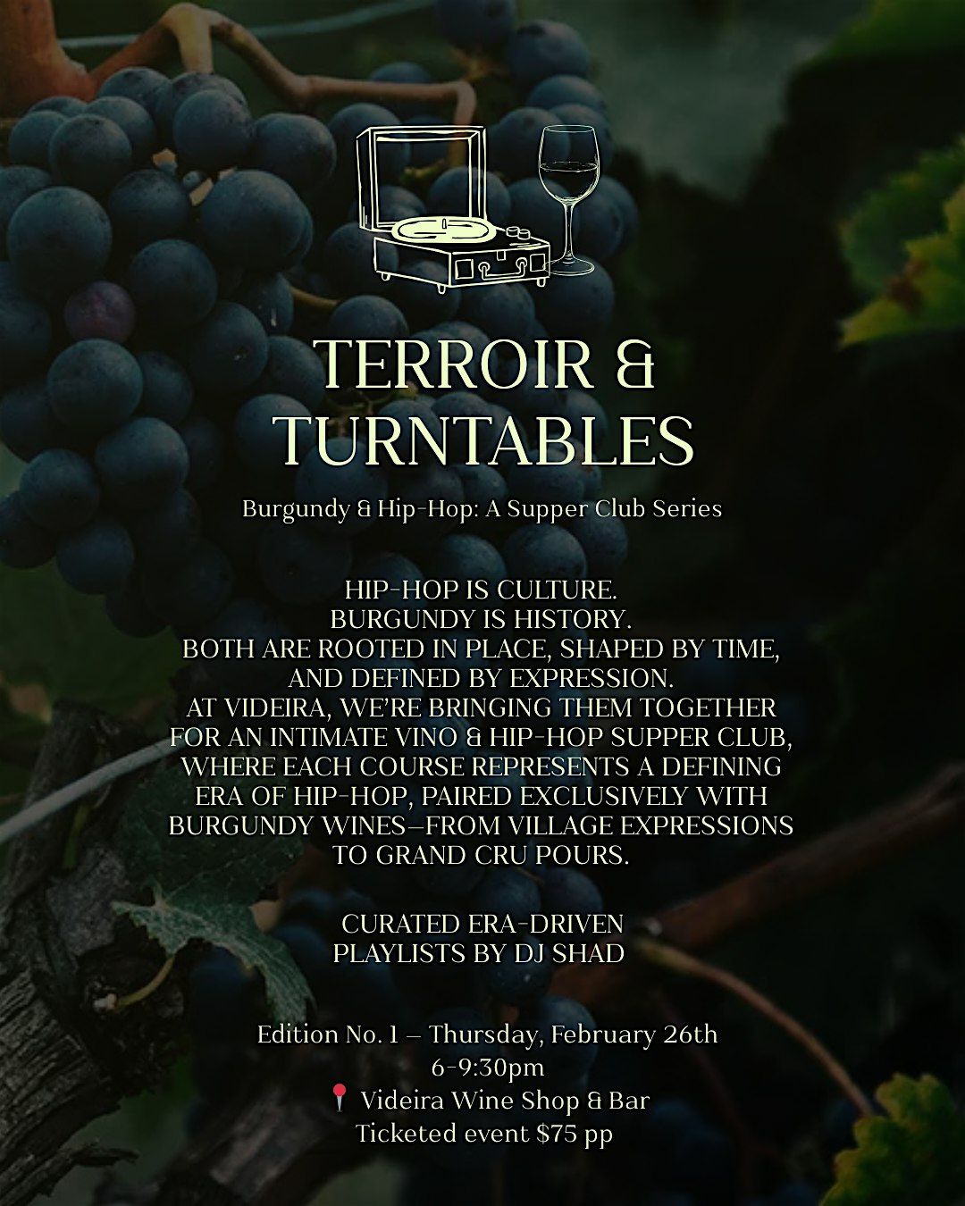 Terroir & Turntables is an intimate supper club experience exploring the connection between place, culture, and expression—through Burgundy wine and hip-hop music.