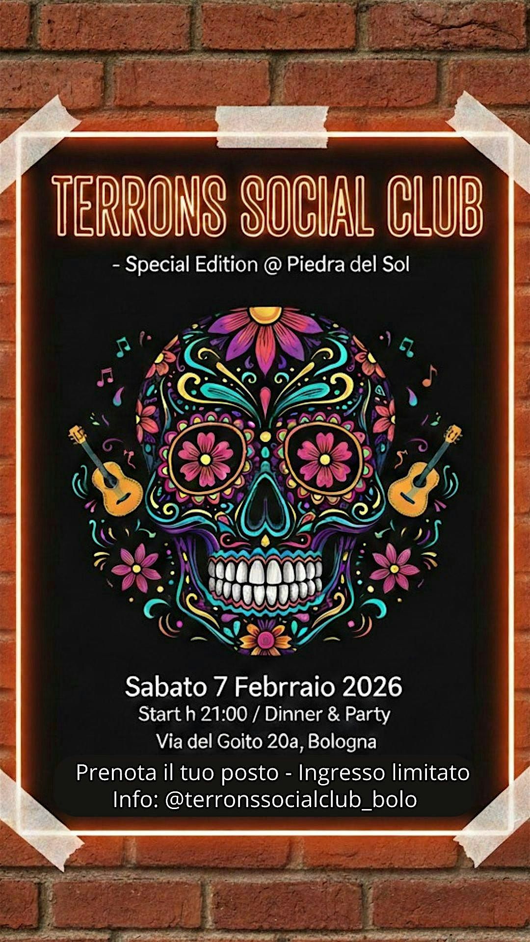 Sabato 7 Febbraio: Terrons Social Club @ Piedra del Sol. Cena & Party a tema messicano nel cuore di Bologna. Prenota il tuo posto!