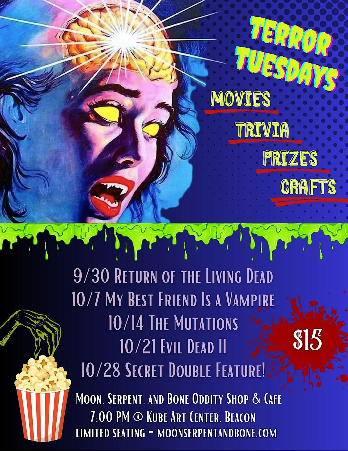 Calling all monster-loving misfits! Tuesday nights this Fall, we’re transforming Moon, Serpent, and Bone Cafe into a horror hideaway, full of cult cinema campiness and B-movie mayhem. Join fellow horror fanatics to pay homage to the twisted, the gory, and the hilariously heinous.