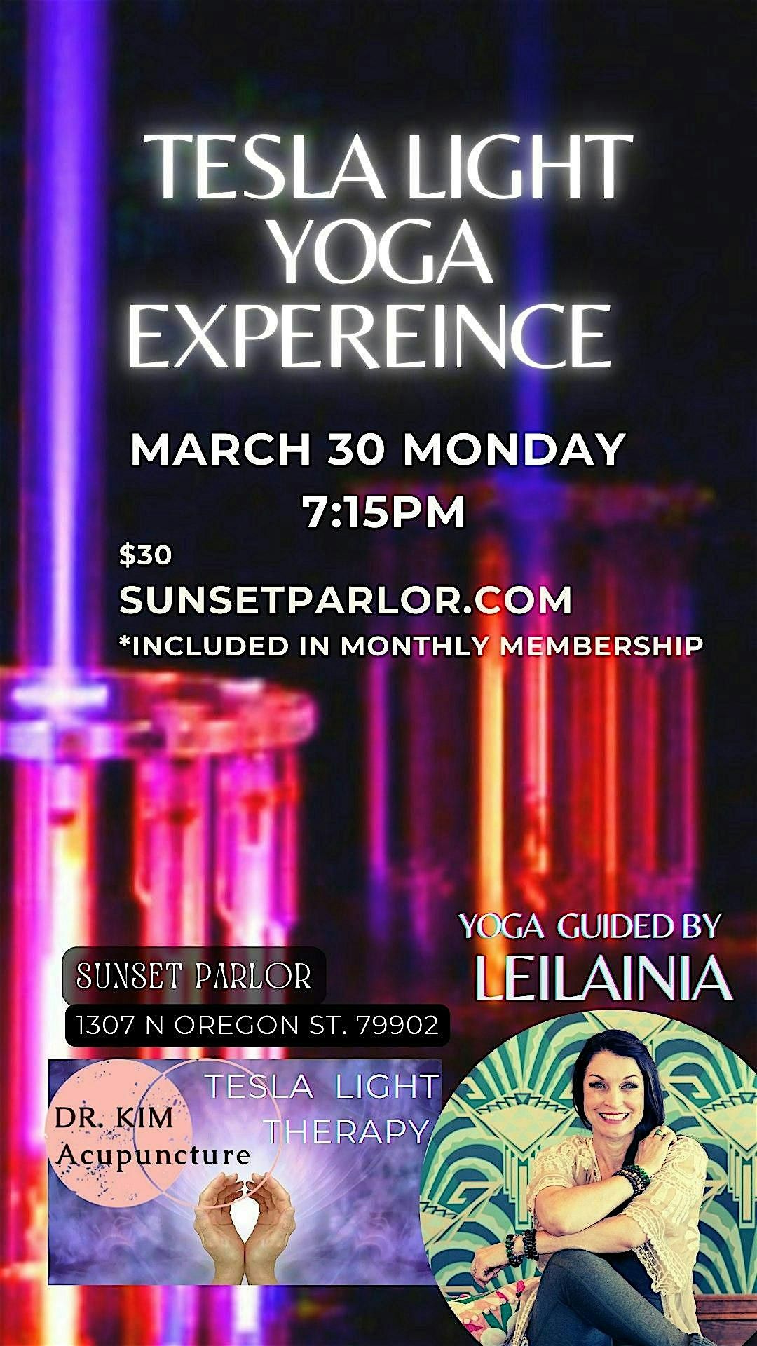 Join us for the Yoga & Tesla Light Energy Healing Experiencewith Leilainia and .• Embrace this Yoga Kundalini Activation with Tesla Energy Lights’ infused intelligence.• Experience advanced energy balancing through ultrahigh frequency electromagnetic energy and photonic light harmonics to cell energy fields.• Honor your labor, express gratitude, and release what no longer serves you during the Harvest Moon.• This evening aligns with the lunar cycle, promoting self-reflection, releasing excess energy, and fostering inner connection.Investment: $30 for the experience.>> Member Benefit: $0.00 Included in Sunset Parlor Monthly Membership Plan