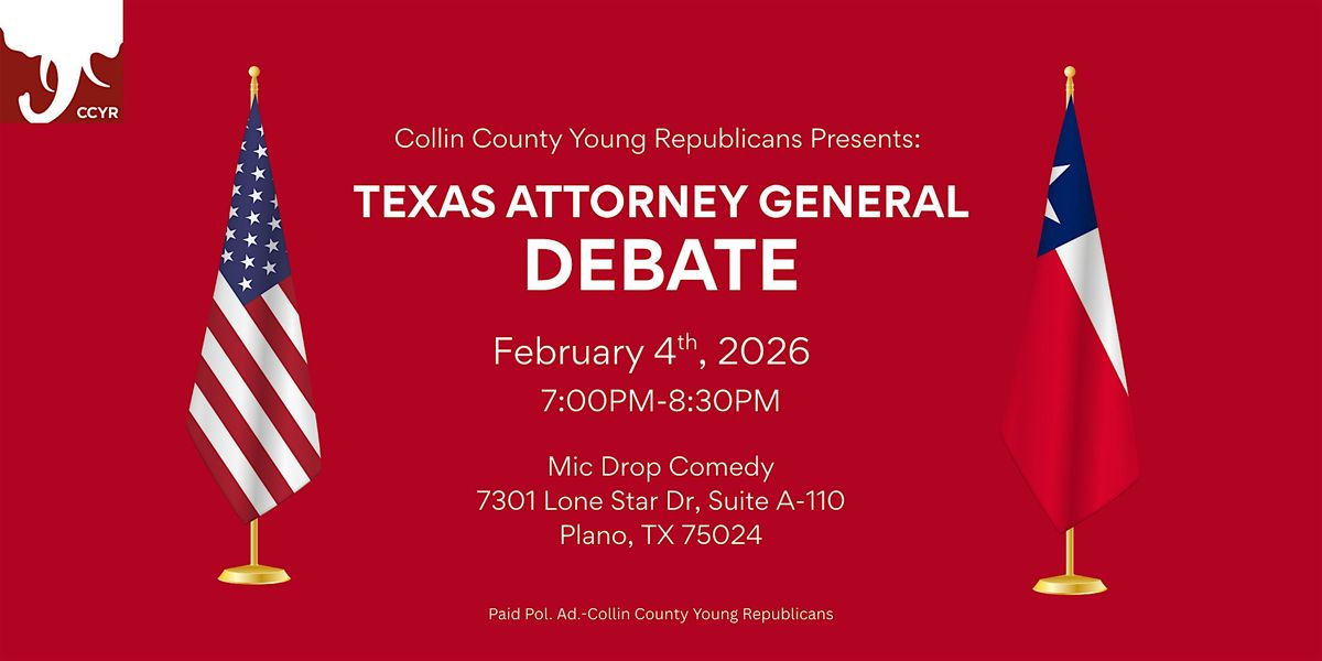 Collin County Young Republicans is exited to present Texas Attorney General Debate on Wednesday, February 4th, 2026 at Mic Drop Comedy in Plano, Texas.