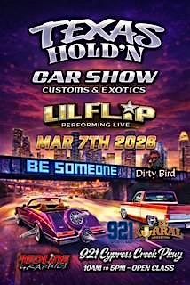 Welcome to the Texas Hold'n Carshow! Get ready for a day filled with sleek rides, cool tunes, and good vibes. Join us for a fun-filled event showcasing some of the hottest cars in town. Roll in with your Classic beauty, Exotic rides, Custom Bikes, Lowriders, and H-town slabs. There's something for every car enthusiast to enjoy. So crank up your engines and ride on down to the Texas Hold'n Carshow.