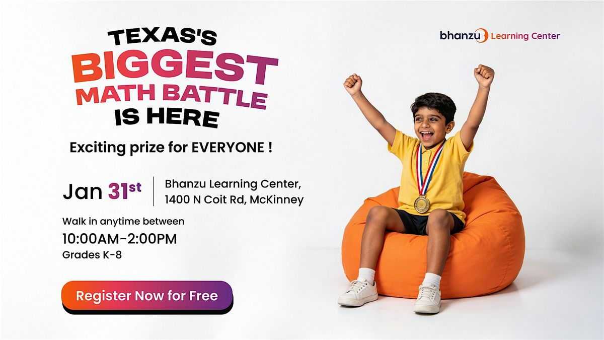 Join us for Texas's Biggest Math Battle! The Bhanzu Ultimate Math Showdown is coming to McKinney, and itβs going to be huge. This isn't just a test; it's a fun, fast-paced challenge where students from Grades K-8 compete head-to-head to win incredible prizes and claim the title of Math Champion!