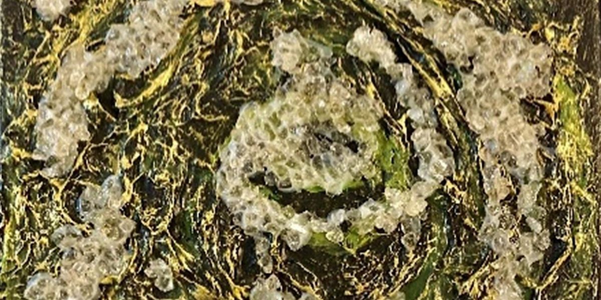 This stunning piece displays a harmonious fusion of texture, color and sparkling elements reminiscent of the natural wonder of geodes. In this class, we will mimic these rugged yet enchanting surfaces using paper and glue to create depth and dimension for the textural elements, then applying layers of paint using dry brushing techniques and finally adding cut glass in natural hues of rose and smoky quartz, among other crystal choices.