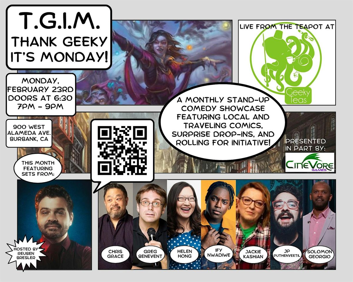 Start your week off right with fellow geeks and stand-up lovers at TGIM! This in-person showcase features local and traveling comics, surprise guests, drop-ins and rolling for initiative. Live from The Teapot at Geeky Teas and games, be there and be square (or any shape you like, we love you all)! Hosted by Reuben Bresler and produced by Jenni Powell and Jackie Kashian.