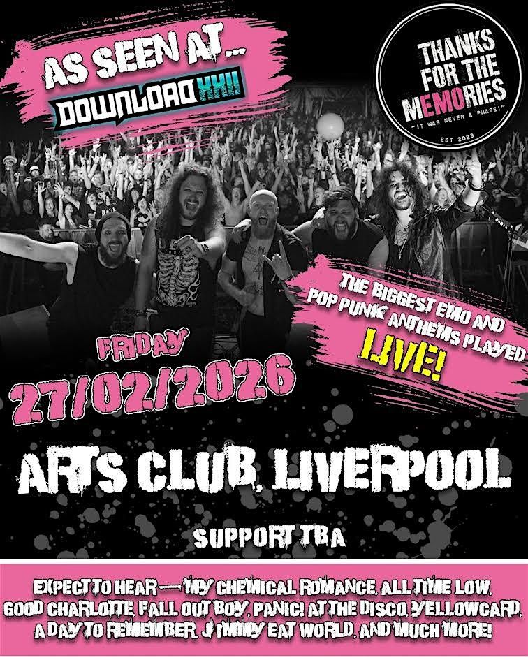 Thanks for the Memories are a FULL LIVE BAND performing the BIGGEST THROWBACK EMO ANTHEMS! Fresh off the back off an amazing DOWNLOAD FESTIVAL - Thanks for the Memories are bringing their larger than life show to some intimate venues this Spring!