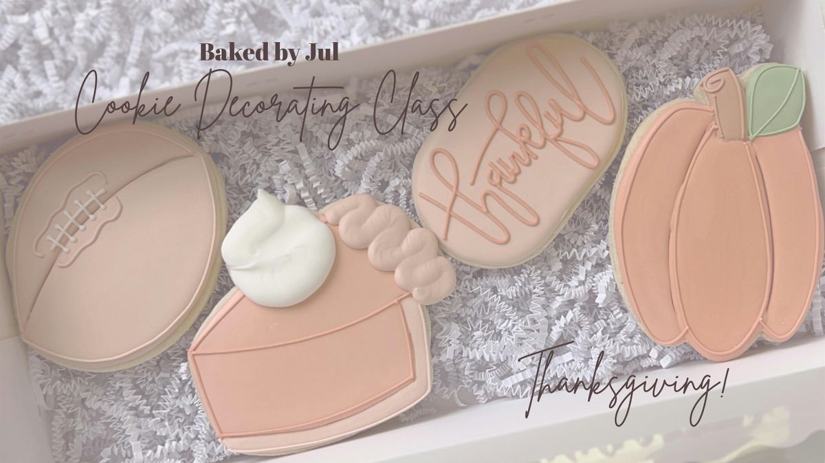 Welcome to our Thanksgiving Cookie Decorating Class, hosted by Baked by Jul! Join us for a fun and hands-on experience where you'll learn how to decorate delicious Thanksgiving themed cookies (pumpkin pie, football & more!). This in-person event is perfect for all ages and skill levels. Don't miss out on this opportunity to unleash your inner cookie artist!