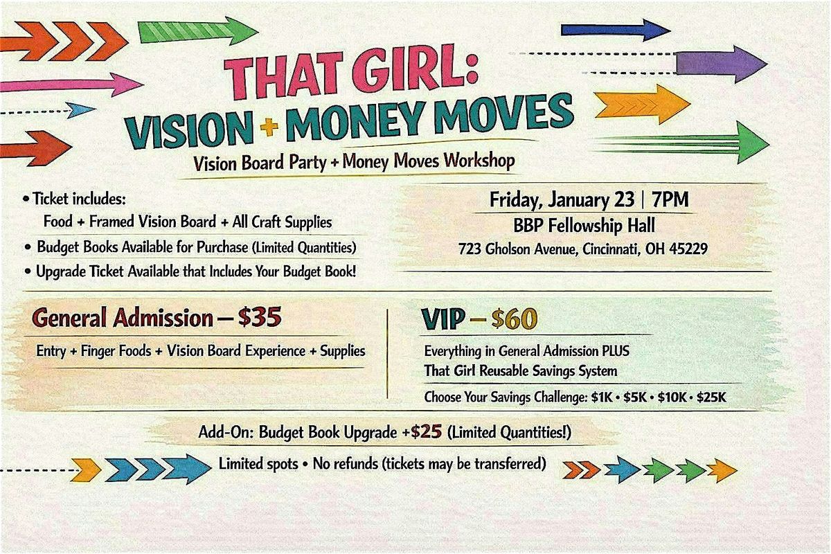 You’ll build a vision board that reflects your next level, then complete a simple “Money Moves” plan so you can walk out with direction and structure.