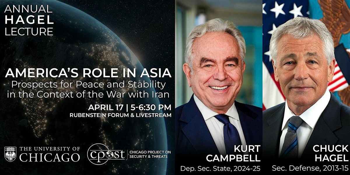 Please join us for the fifth lecture of our annual lecture series, a forum to amplify and encourage greater civic participation in critical discussions. Chuck Hagel, the 24th U.S. Secretary of Defense, and keynote guest Kurt Cambpell, Deputy Secretary of State (2024-2025), will discuss challenges facing American foreign policy toward Asia in the context of the war against Iran.