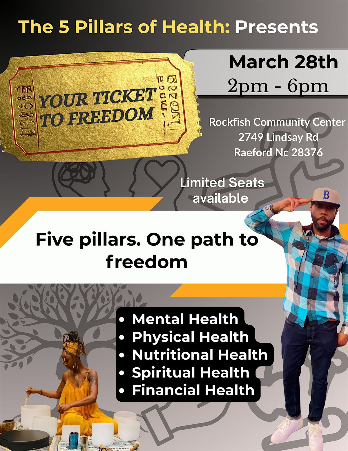 Ticket to Freedom is an interactive wellness experience exploring the five pillars of health: spiritual, mental, physical, financial, and nutritional. This immersive event invites you to experience healing, clarity, and growth — not just talk about it.