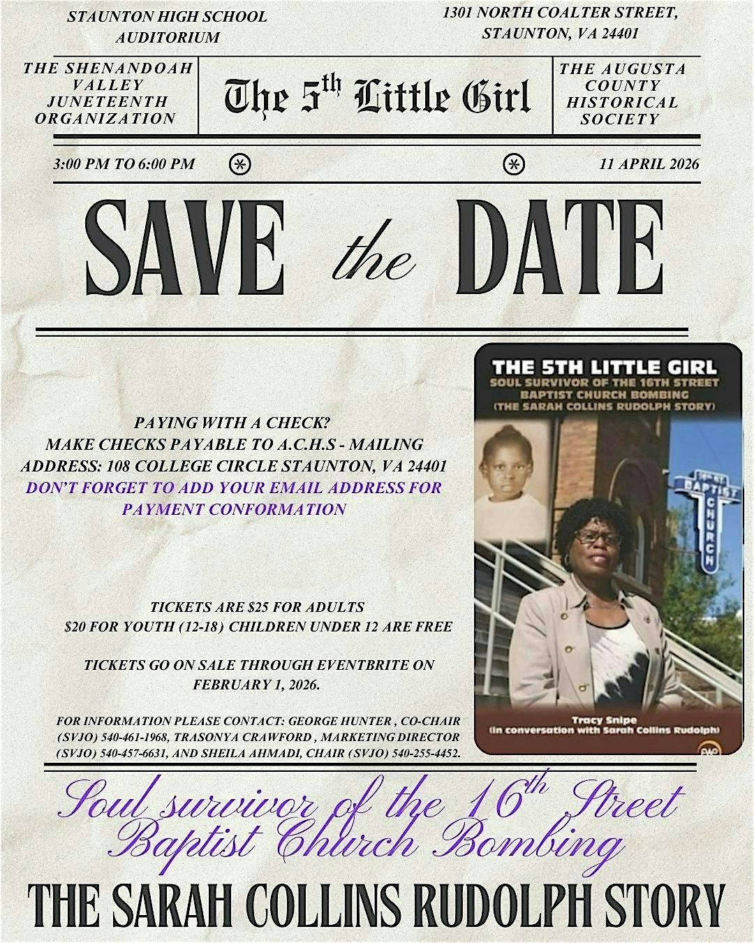 Join us for an inspiring talk from Sarah Collins Rudolph. This event provides a personal reflection from the survivor of the 1963 bombing of the16th Street Baptist Church in Birmingham, Alabama. Rudolph will provide a unique first-person perspective on a pivotal moment in the Civil Rights Movement. The 5th Little Girl is all about connecting, sharing stories, and making memories. Don’t miss out on this unique chance to be part of something special!