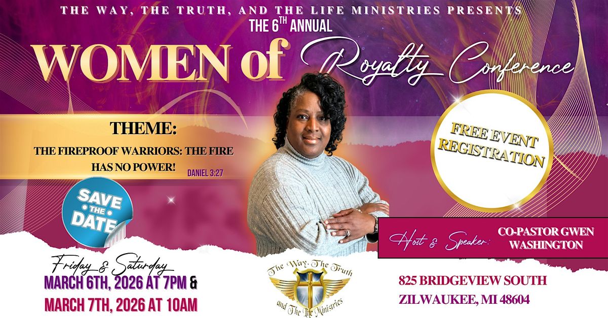 Women of Royalty Conference presented by The Way, The Truth, and The Life Ministries invites you into two transformative days under the theme, The Fireproof Warriors: The Fire Has No Power (DANIEL 3:27). Join us Friday night March 6th, 2026 at 7PM and return Saturday March 7th, 2026 at 10AM for a dynamic guest panel featuring real fireproof warriors who have stood in the heat and still shine. This free two-day gathering is designed to ignite your faith, strengthen your courage, and remind you that the flames meant to consume you cannot touch what God has covered. Expect powerful teaching, heartfelt praise and worship, meaningful connection with other women, conference swag bags, and a light lunch on Saturday. Come rested or tired, curious or bold, but leave renewed, encouraged, and ready to move forward with holy confidence and unshakable faith. Registration is FREE; bring your sisters, your Bible, and expectation.