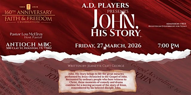 Antioch MBC with Pastor Lou and First Lady Jackie McElroy will host The A.D. Players and George Theater as they present the play: John, His Story!
