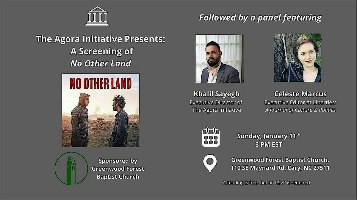 Join us for a thought-provoking evening beginning with the Academy Award-winning documentary No Other Land. A panel discussion will follow with Khalil Sayegh (The Agora Initiative) and Celeste Marcus (Liberties: A Journal of Culture and Politics).