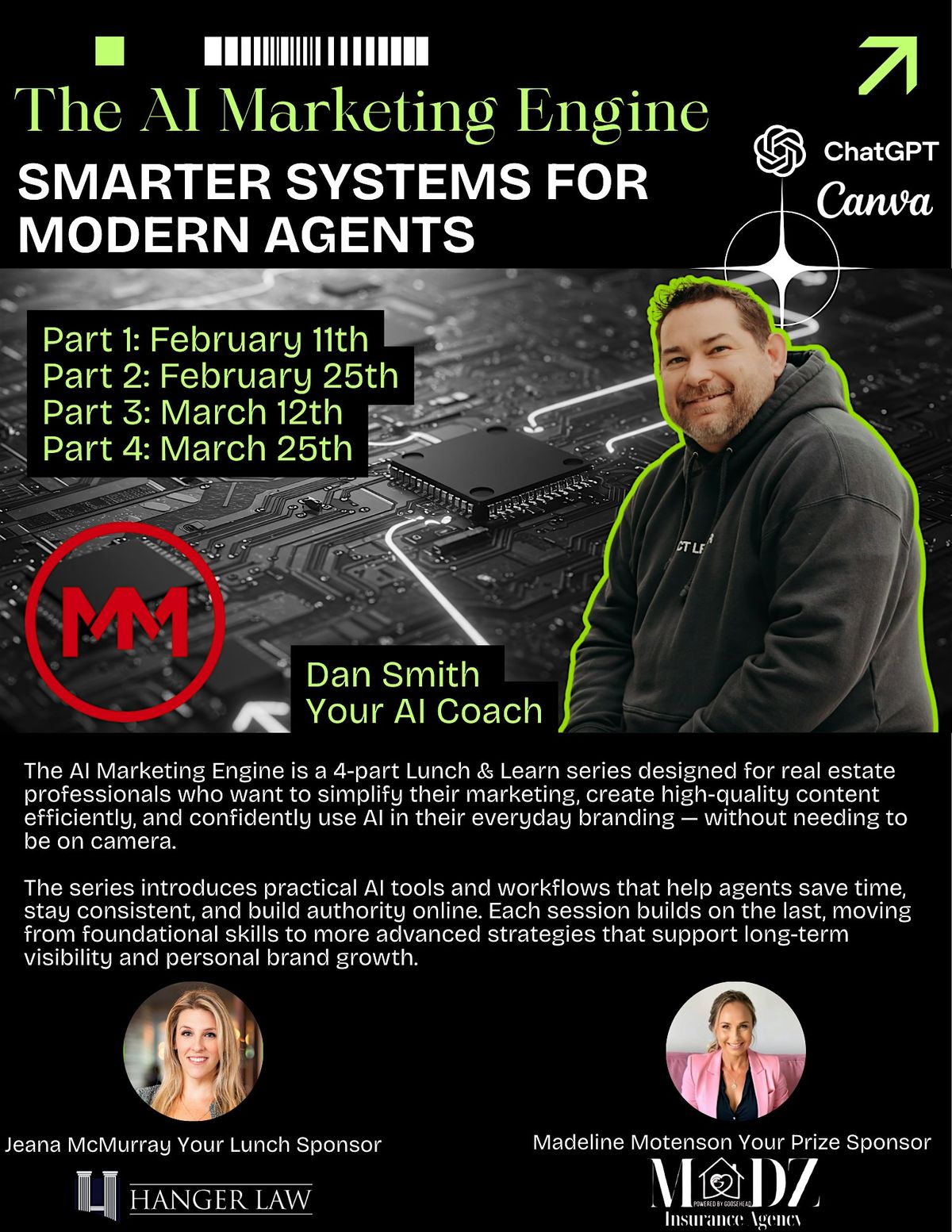 The AI Marketing Engine is a 4-part Lunch & Learn series designed for real estate professionals who want to simplify their marketing, create high-quality content efficiently, and confidently use AI in their everyday branding — without needing to be on camera.