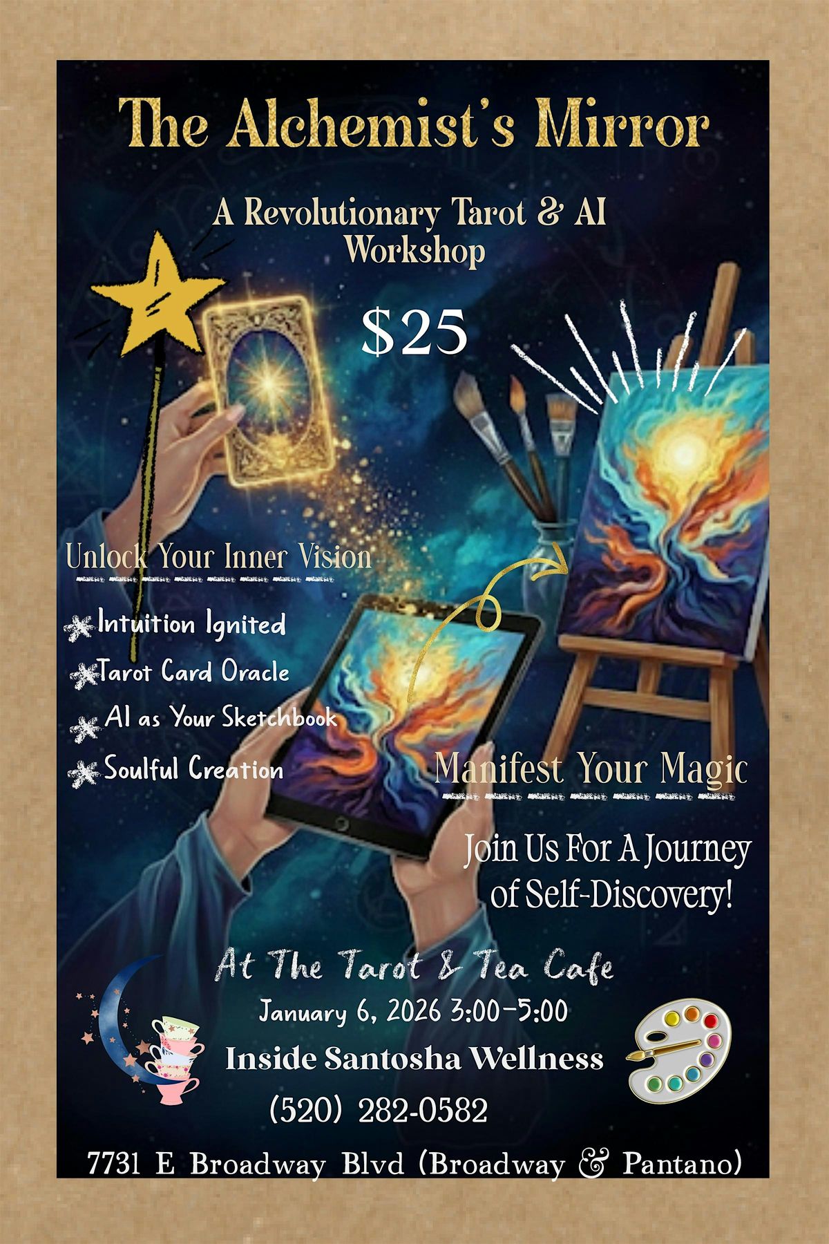 Welcome to The Alchemist's Mirror event at Santosha Wellness Yoga! January 6, 2026 at 3:00-5:00PM. A Study in the Alchemy of the 22 Major Arcana of The Tarot, is the first in a series of events featuring tarot card readings and energy healing clinics. We will discover the hidden secrets of the Tarot Oracle and explore the wisdom of Native American Tribal Shamans. Unlock your inner vision and creativity, find peace and clarity in this workshop where science meets divination and art meets techology. A soulful experience, this unique event is designed to ignite your intuition and spark your creativity as we lead you on a journey of self-discovery and enlightenment! Come along with us and Manifest your Magic!