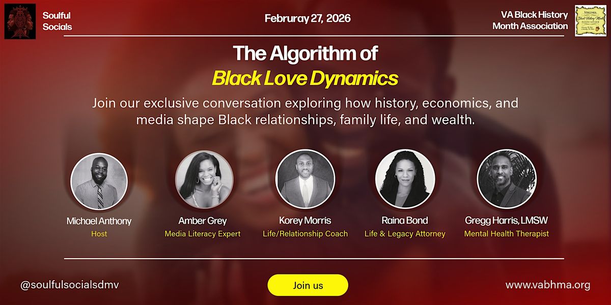 The Algorithm of Black Love Dynamics will take place in conjunction with The 26th Annual Virginia Black History Month Gala as a part of their health fair in Arlington, VA. Admission to this panel discussion is free.