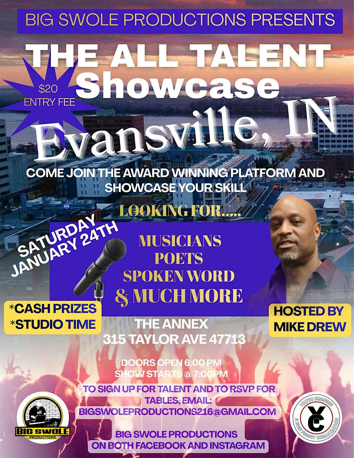 Join us in person for an amazing event celebrating incredible local talent from Evansville, Indiana. Whether you're an artist, performer, or just love discovering new talent, this showcase is where the magic happens. Don't miss out on an unforgettable experience filled with creativity and fun. See you there!