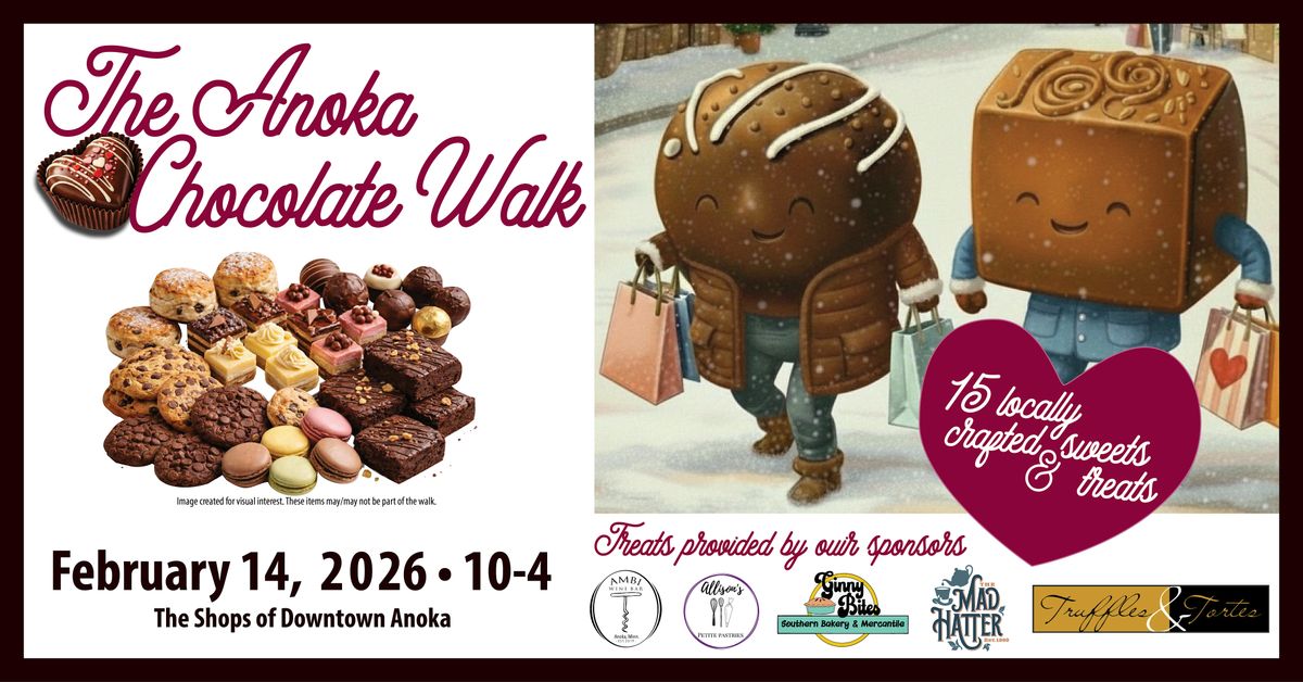 Join us for a sweet adventure in Downtown Anoka! For $30, your ticket gets you a Chocolate Walk bag and map and locally handcrafted chocolate treats at 15 local shops and vendors -- think of it as a chocolate charcuterie you get to stroll through! Wander the streets of Downtown Anoka and the Social District, sampling all the delicious goodies along the way. It’s the perfect outing to treat yourself, catch up with friends, and soak in the festive vibes. Whether you’re a chocoholic or just looking for a fun day out, there’s plenty of chocolate and good time to go around!