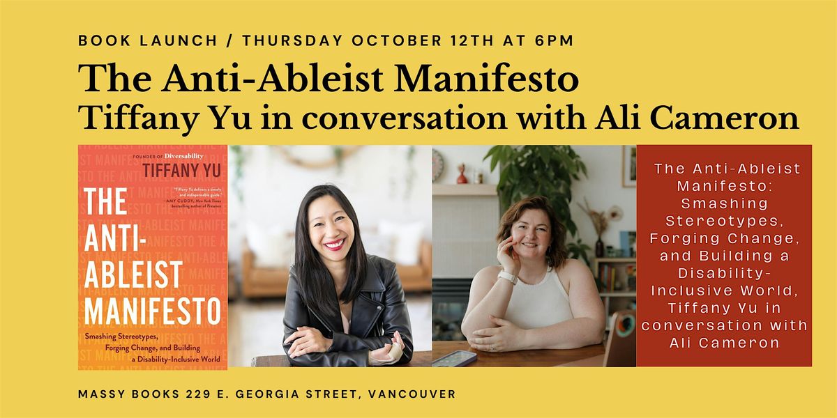 Join Massy Books and Legacy Lit as we host Tiffany Yu in Conversation with Ali Cameron for the launch of “ The Anti-Ableist Manifesto: Smashing Stereotypes, Forging Change, and Building a Disability-Inclusive World.” On Saturday, April 11th at Massy Books, we will spend an evening examining disability—how to unpack biases and build an inclusive and accessible world.