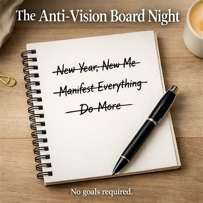 The Anti-Vision Board Night is a guided, casual group experience designed to help you release old rules, outdated expectations, and internal pressure, ALL without turning it into a heavy self-help seminar.