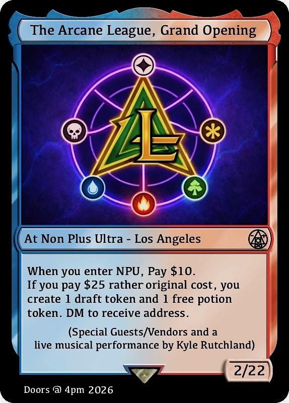 A fantasy-themed card and gaming event featuring Magic: The Gathering draft & play, vendors, special guests, and a live music performance by Kyle Rutchland.