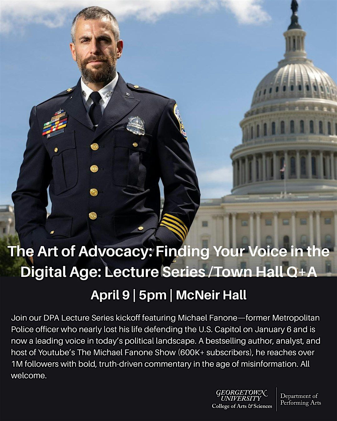 Join our DPA Lecture Series kickoff featuring Michael Fanone—former Metropolitan Police officer who nearly lost his life defending the U.S. Capitol on January 6 and is now a leading voice in today’s political landscape. A bestselling author, analyst, and host of Youtube’s The Michael Fanone Show (600K+ subscribers), he reaches over 1M followers with bold, truth-driven commentary in the age of misinformation. All welcome.