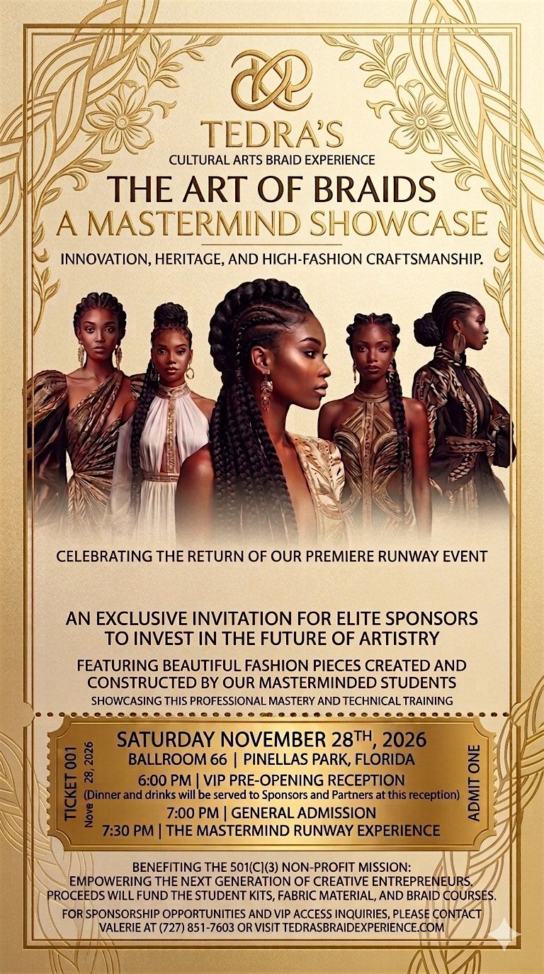 Your attendance benefits the 501(c)(3) non-profit mission of Tedra’s Cultural Arts Braid Experience. We are dedicated to empowering the next generation of creative entrepreneurs. 100% of proceeds from this event fund student kits, fabric materials, and professional braid courses for youth in our community.