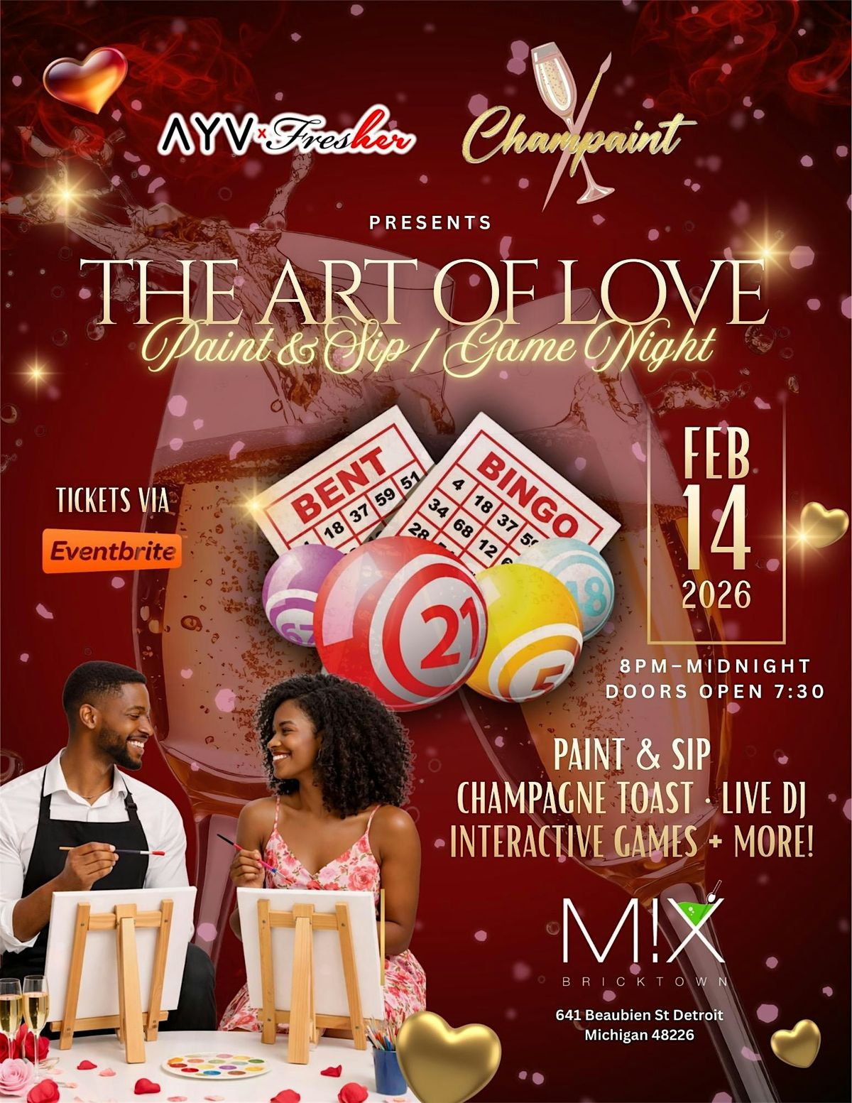 Welcome to The Art of Love Paint & Sip Game Night at Mix Bricktown! Get ready for a night filled with creativity, fun, and love on Valentine's Day! Doors open promptly at 7:30 PM(EST) so guests can position themselves for an exciting night! Join us for a unique experience with Champaint where you can unleash your artistic side while enjoying great company - your lover ;). No matter your skill level, this event is all about having a good time. Grab a brush, sip on your favorite drink, and let your imagination flow as DJ Epik fills the room with R&B love songs and dance music.