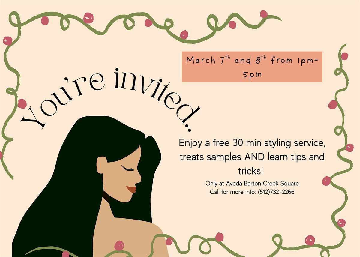Welcome to The art of Pure Styling event happening at Aveda Store on March 7th and 8th from 1pm-5pm. Get ready to dive into the world of pure styling techniques and unleash your creativity! Join us for a fun and interactive session where you'll learn the latest trends and tips from industry experts. Whether you're a seasoned stylist or just starting out, this event is perfect for anyone passionate about hair styling. Don't miss out on this exciting opportunity to elevate your skills, enjoy treats AND take home a free gift with a purchase of select hair care items . See you there!