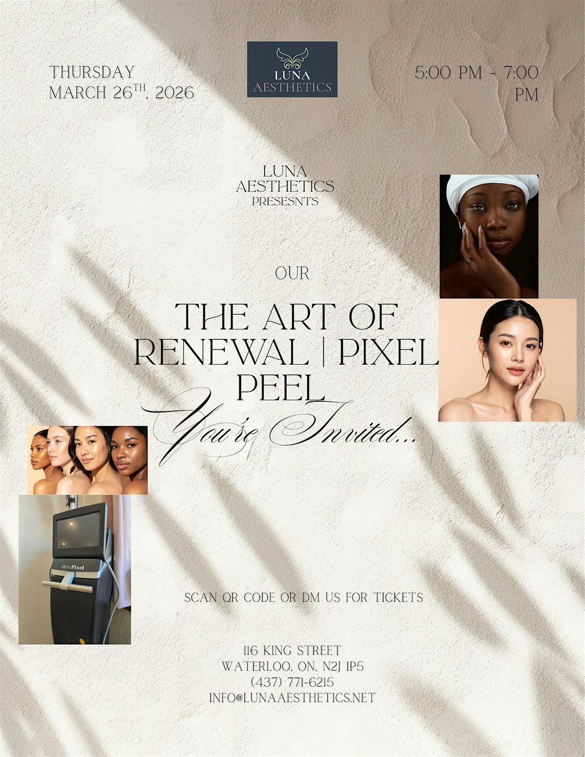 Join us for an exclusive evening at Luna Aesthetics as we unveil Pixel Peel, our newest advanced laser treatment designed to refine, restore, and renew the skin with precision and intention.