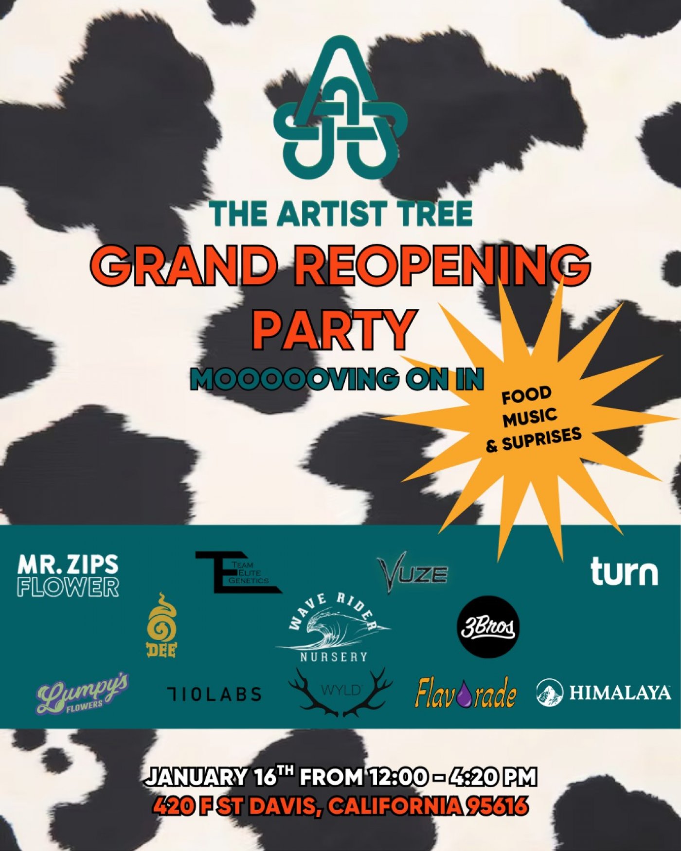 Celebrate the grand reopening of The Artist Tree in Davis with an afternoon of good vibes, community, and cannabis culture. Enjoy food, music, and special surprises while connecting with top brands including Mr. Zips Flower, Wyld, Himalaya, Turn, 3 Bros, Vuze, Wave Rider Nursery, and more. Come through, check out the refreshed space, and help The Artist Tree kick off this next chapter in style.
