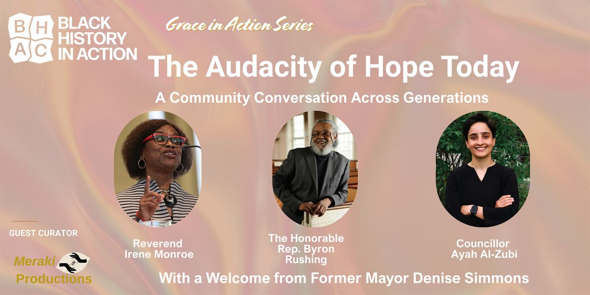 For our next event, join us for The Audacity of Hope Today, a conversation bringing together three inspiring leaders in the struggle for justice and peace, representing three generations. Our speakers are Reverend Irene Monroe, The Honorable Rep. Byron Rushing, Former Member of the Massachusetts House of Representatives, and
