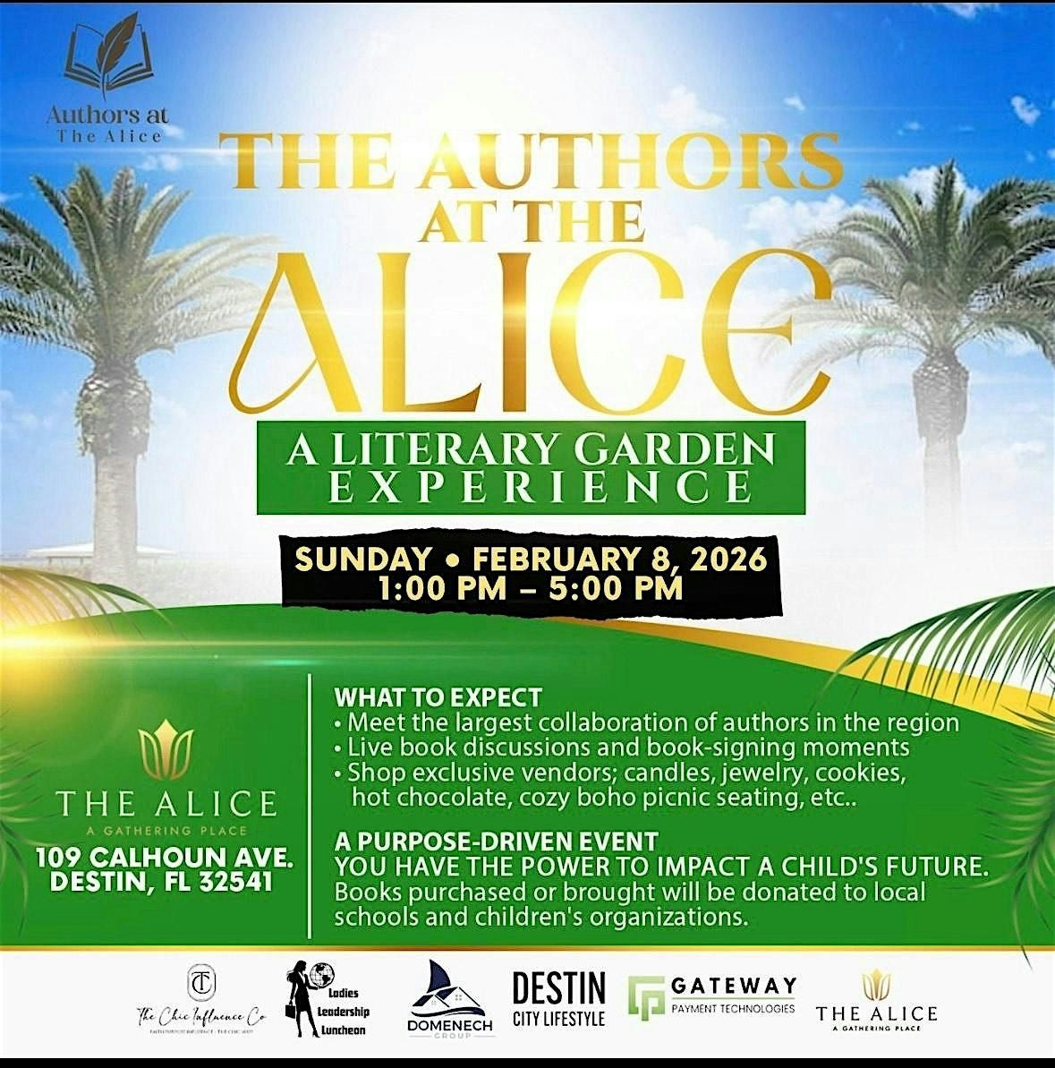 Meet a collaboration of Authors from all over the Southeast. Participate in live book discussions and book signings. Shop exclusive vendors showcasing candles, jewelry, cookies, hot coco in a cozy boho picnic setting. Sit in the beautiful gardens at The Alice and enjoy the beautiful surroundings.