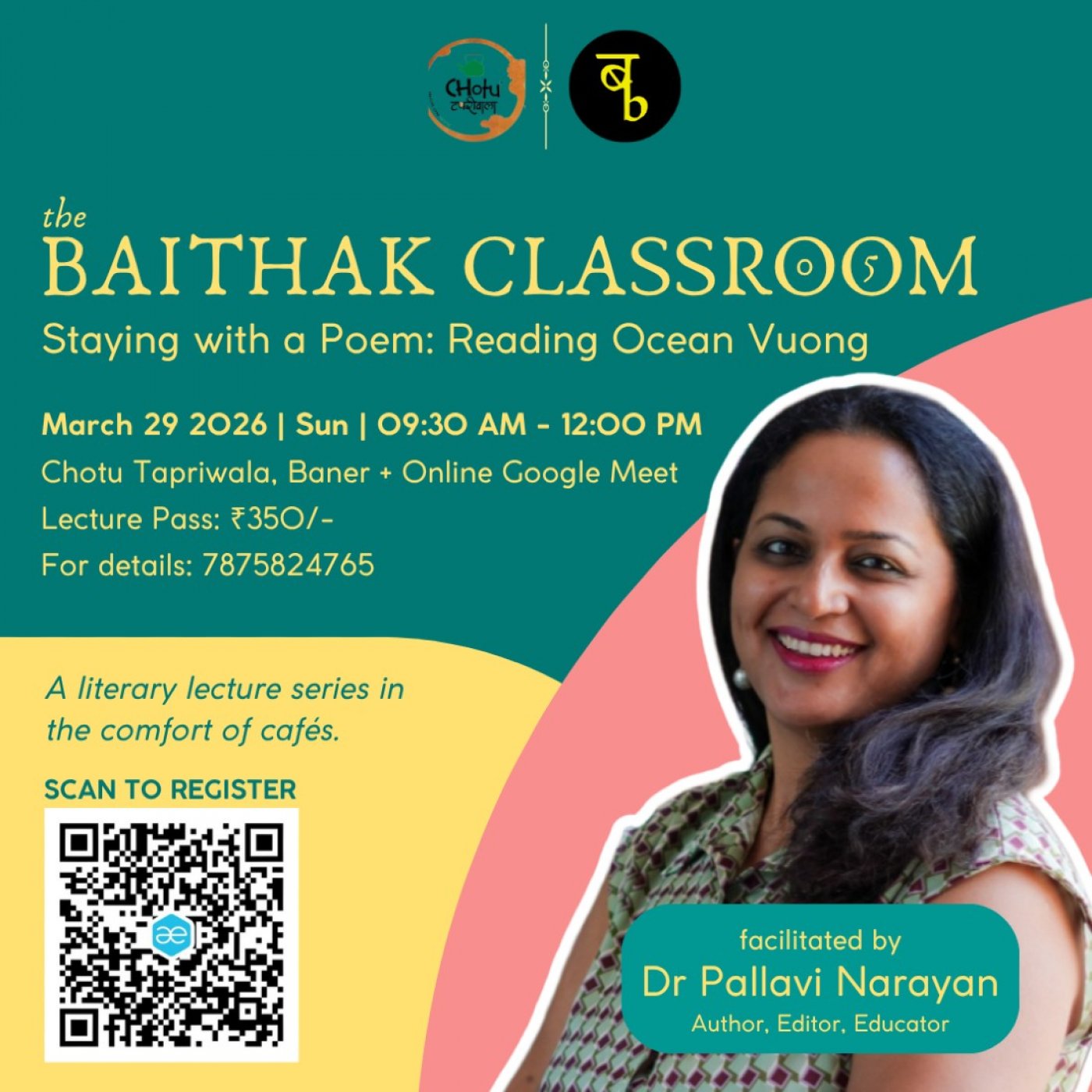 A literary lecture on the poetry of Ocean Vuong, spread across 2 interactive, engaging hours. The lecture will dive deep into a selected poem by Ocean Vuong, with sharp and incisive critical analysis. If you love literature and wish to learn more about understanding poetry, this one's for you!