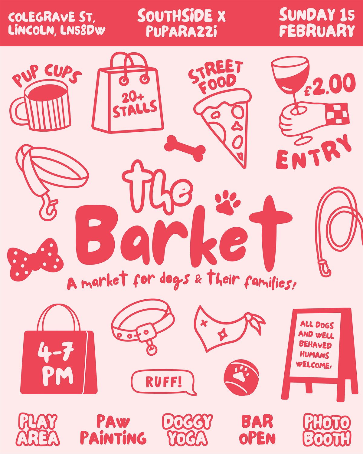 After the walk, you’re invited (optional but highly recommended!) to head over to Southside, opposite the Common, to attend The Barket – Lincolnshire’s only twilight dog market.