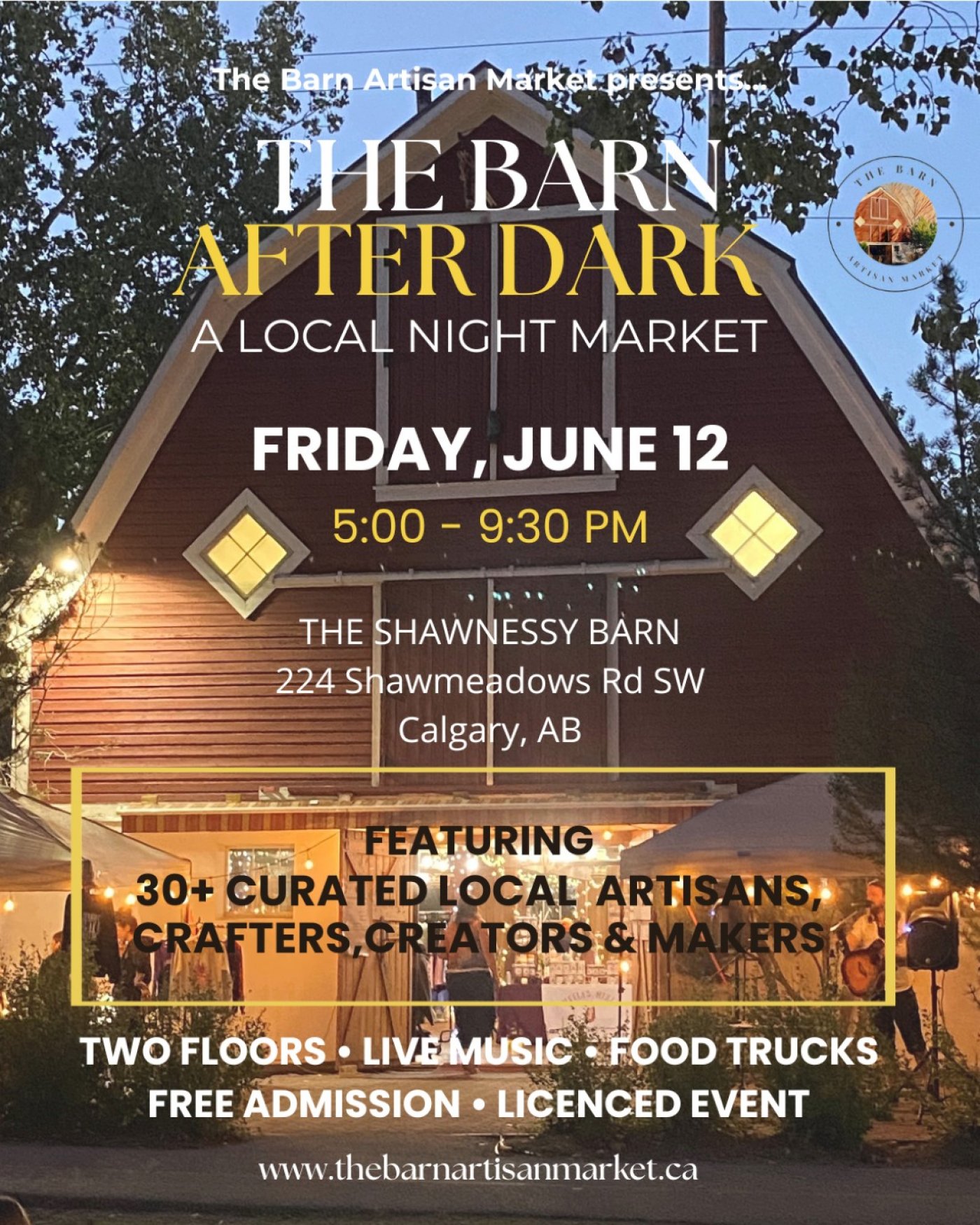 Come "Sip & Shop" with us on Friday, June 12th for our first of two night markets we're hosting at the historic Shawnessy Barn in SW Calgary! We'll have 34 local vendors over two floors featuring hand-crafted, created, and made in Alberta products, as well as live music, food trucks, and a bar hosted by the Shawnessy Community Association.